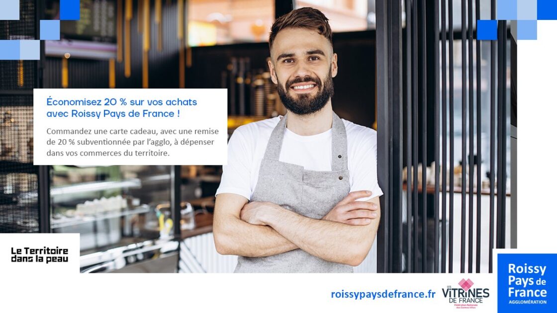 Recevez 20 % de remise immédiate à l’achat d’une carte cadeau sur la plateforme dédiée aux commerces commerces.roissypaysdefrance.fr
