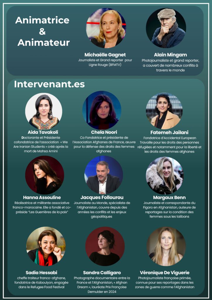 Récolte de fonds pour les femmes en Afghanistan en présence d’Aïda Tavakoli (Doctorante et Présidente cofondatrice de l’association « We Are Iranian Students »), Chela Noori (Co-fondatrice et présidente de l’Association Afghanes de France, œuvre pour la défense des droits des femmes afghanes), Fatemeh Jaillani (Fondatrice d’Accidental European, travaille pour les droits des réfugiés et la liberté des femmes afghanes), Hanna Assouline (Réalisatrice et militante associative franco-marocaine, fondatrice et co-présidente de « Les Guerrières de la paix »), Jacques Follourou (Journaliste au Monde, spécialiste de l’Afghanistan), Margaux Benn (Journaliste et correspondante du Figaro en Afghanistan), Sadia Hessabi (Cheffe traiteur franco-afghane, fondatrice de Kaboulyon, engagée dans le Refugee Food Festival), Sandra Calligaro (Photographe documentaire entre la France et l’Afghanistan, lauréate du Prix Françoise Demulder en 2024) et Véronique De Viguerie (Photojournaliste française primée, spécialisée dans les reportages en zones de guerre comme l’Afghanistan).