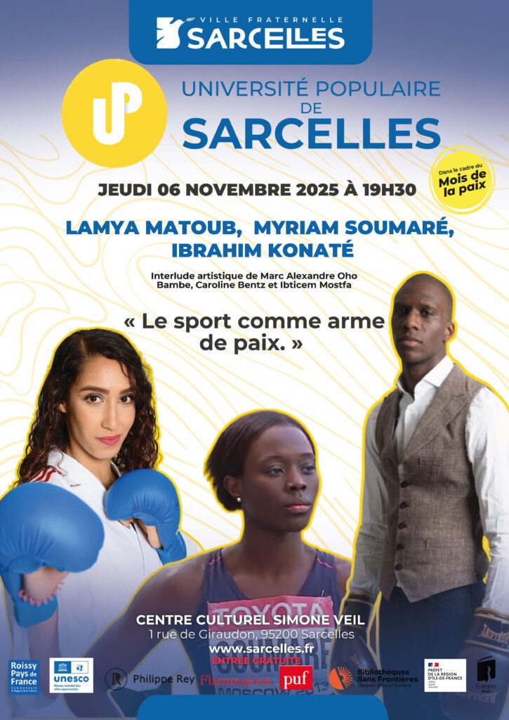 Rencontre avec 3 sportifs sarcellois, Lamya Matoub (championne olympique de karaté), Myriam Soumaré (championne d’Europe du 200m en athlétisme) et Ibrahim Konaté (Champion du Monde 2013 en Viet Vo Dao et Champion du Monde 2017 en Boxe Française) : « Le sport comme arme de Paix »