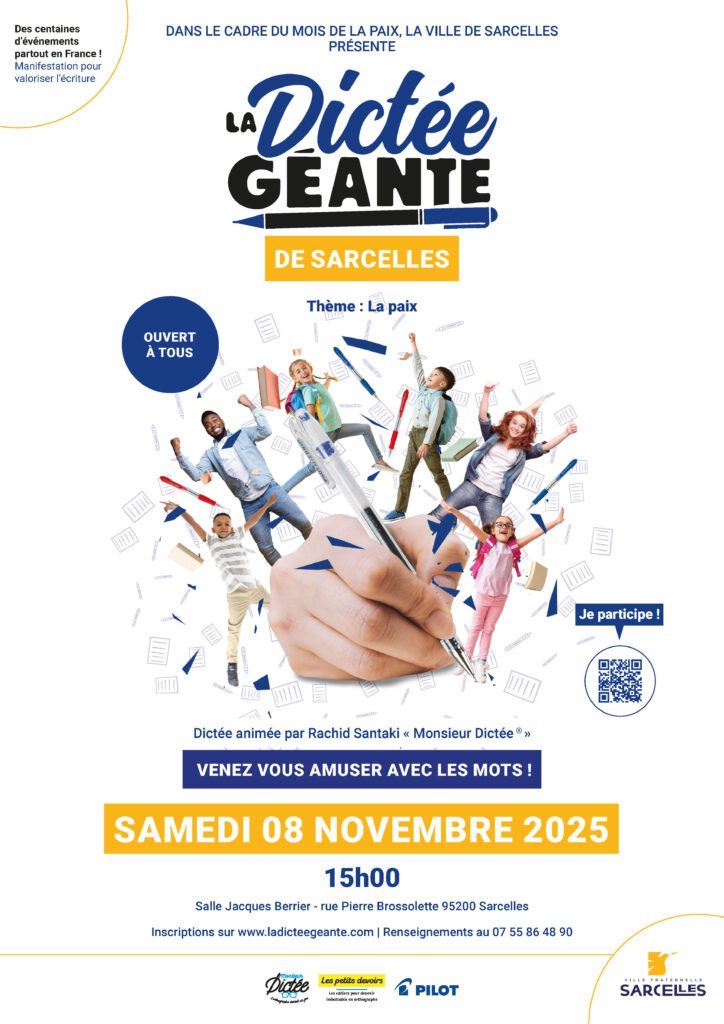Retrouver le fameux Rachid Santaki autour d’une dictée géante sur la thématique de la Paix. Après avoir fait vibrer les Champs-Élysées, la Tour Eiffel et le Stade de France avec ses dictées géantes. C’est le tour de Sarcelles, Monsieur Dicté, vous donne rendez-vous pour une nouvelle aventure autour des mots.