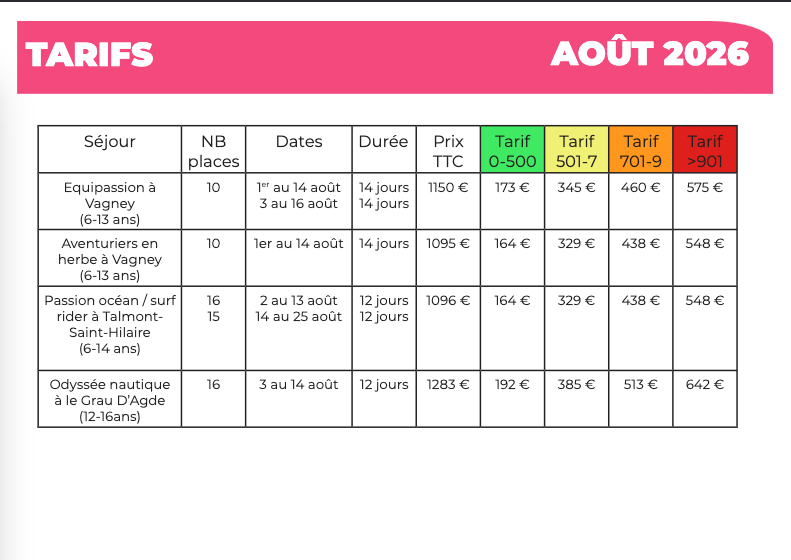 – Justificatif(s) de subventions CAF (Aide aux Vacances Enfants, PASS COLO…), si vous en