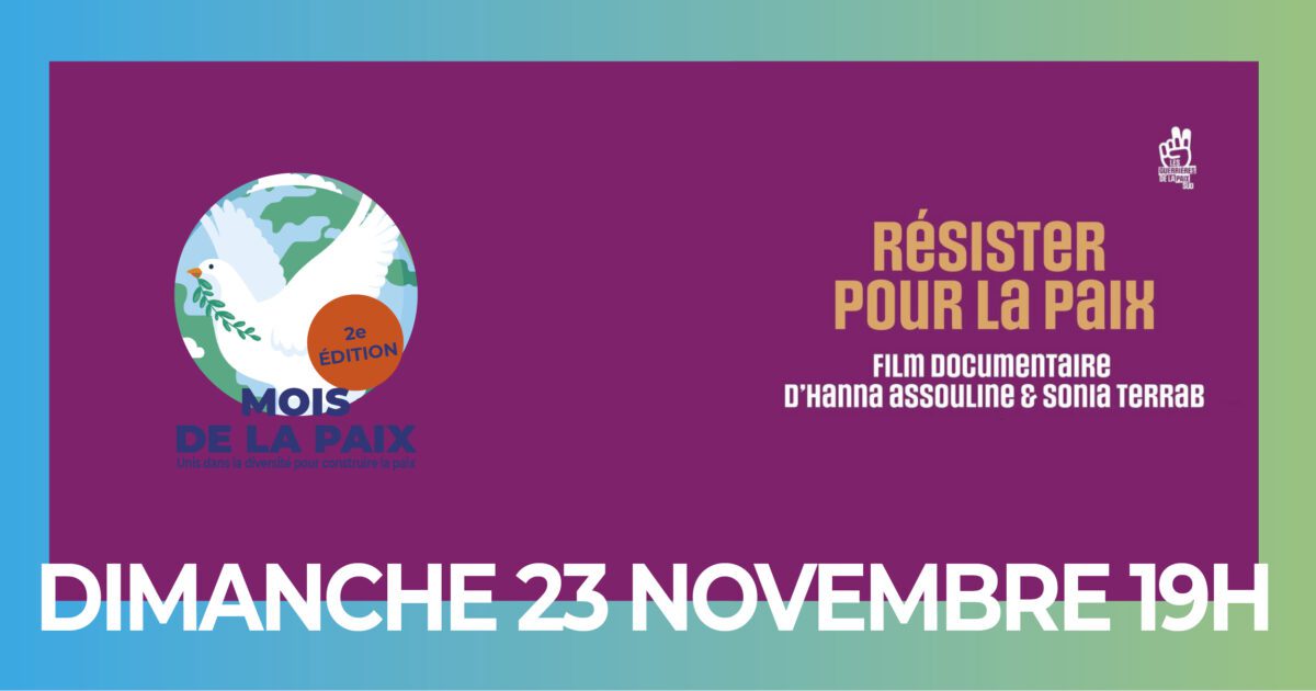 Dimanche 23 novembre de 19h à 22h30 Projection du film « Résister pour la paix » à la salle André Malraux, avec les Guerrières de la Paix, Hanna Assouline et Sonia Terrab.
